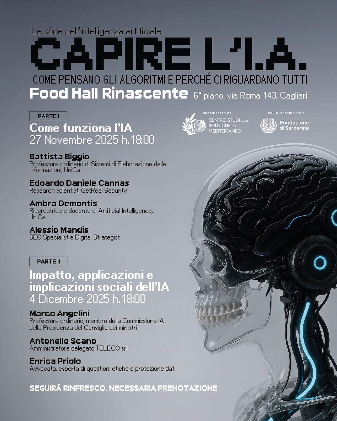 Capire l’IA è un ciclo di incontri dedicato a spiegare in modo chiaro e accessibile come funziona l’intelligenza artificiale, quali sono le sue applicazioni concrete e quali effetti produce sulla società, sull’economia e sulle decisioni collettive. Attraverso il contributo di Battista Biggio e Ambra Demontis (Università di Cagliari), Edoardo Daniele Cannas (GetReal Security), Alessio Mandis (SEO & Digital Strategist), Marco Angelini (Commissione IA – Presidenza del Consiglio dei Ministri), Antonello Scano (TELECO srl) ed Enrica Priolo (avvocata, esperta di etica e protezione dei dati), l’evento affronta temi come algoritmi, sicurezza, etica, lavoro e diritti, favorendo un confronto aperto tra esperti, istituzioni e cittadinanza.